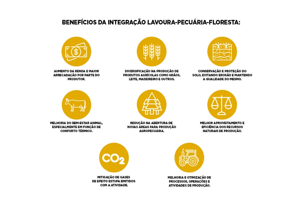 Entre os benefícios podemos citar o aumento de renda, diversificação de produção, redução na abertura de novas áreas para produção agropecuária e diminuição de gases do efeito estufa. Veja abaixo outros benefícios da ILPF: