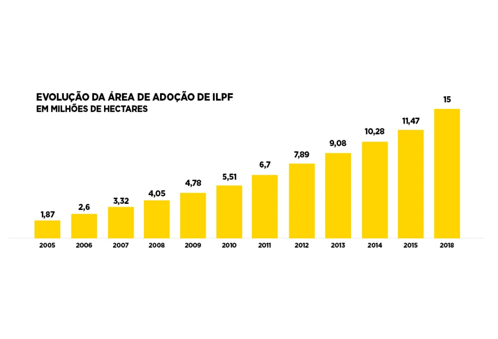 Entre 2005 e 2018, o crescimento nas áreas com adoção do sistema ILPF foi superior em oito vezes, atingindo 15 milhões de hectares. Desses 15 milhões, 10 milhões foram alcançados em 10 anos: de 2008 a 2018, e a estimativa é que o potencial para áreas de ILPF no Brasil seja de 30 milhões de hectares.